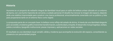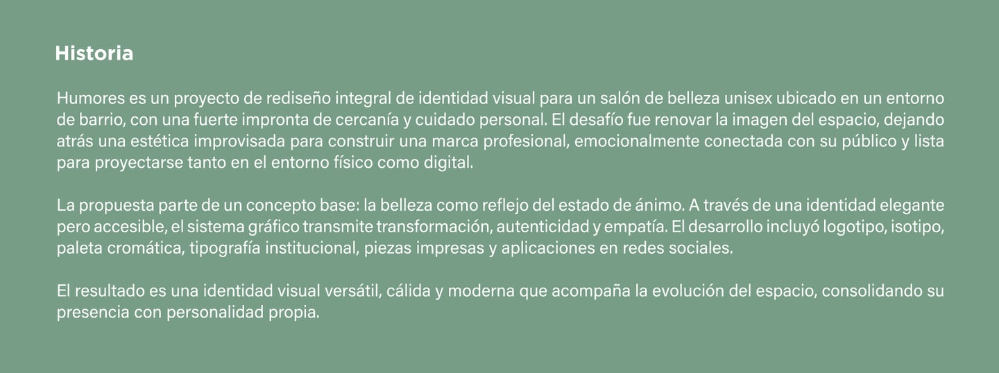 Proyecto de identidad visual desarrollado para Humores, salón de belleza unisex ubicado en un barrio de tradición y cercanía. El trabajo se centró en renovar la imagen de la marca para reflejar su esencia actual: un espacio de cuidado personal integral que acompaña el estilo y el estado de ánimo de cada cliente.
